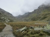 Het volgende doel is daarom de Saarbrückerhütte. In het bewolkte Ochsental lopen we weer richting Silvretta stausee om via het Klostertal omhoog te klimmen naar het Lintznersattel op 2737m. De klim verloopt via een korte klettersteig en de miezerregen blijft gestaag vallen. We hebben dan ook al vanaf het begin van de klim onze regenjassen aan. Op de vlakte, vlak voor het Lintznersattel rusten we even uit, maar de wind maakt het tot een onaangenaam oord.