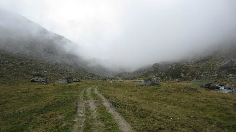 Het volgende doel is daarom de Saarbrückerhütte. In het bewolkte Ochsental lopen we weer richting Silvretta stausee om via het Klostertal omhoog te klimmen naar het Lintznersattel op 2737m. De klim verloopt via een korte klettersteig en de miezerregen blijft gestaag vallen. We hebben dan ook al vanaf het begin van de klim onze regenjassen aan. Op de vlakte, vlak voor het Lintznersattel rusten we even uit, maar de wind maakt het tot een onaangenaam oord.