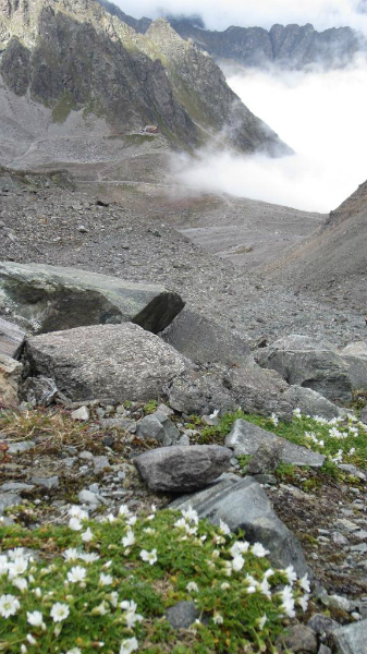 Vanuit het dal stijgt opgewarmde bewolking ons tegemoet, en ontneemt al snel het zicht op de mooi gelegen Saarbrückerhütte. Een korte steile afdaling voert via het smalle pad langs zwart-grijze morenen naar de weg. Terwijl Ad net de beek oversteekt en in spagaat op 2 rotsblokken staat te balanceren, belt Rob uit Canada op; zoals afgesproken. Op het terras van de Saarbrückerhütte kunnen we hem terug bellen. Hans en Mieke feliciteren we per sms met hun 25 jarig huwelijk, Zuid-Afrika blijkt toch verder weg dan Canada…..